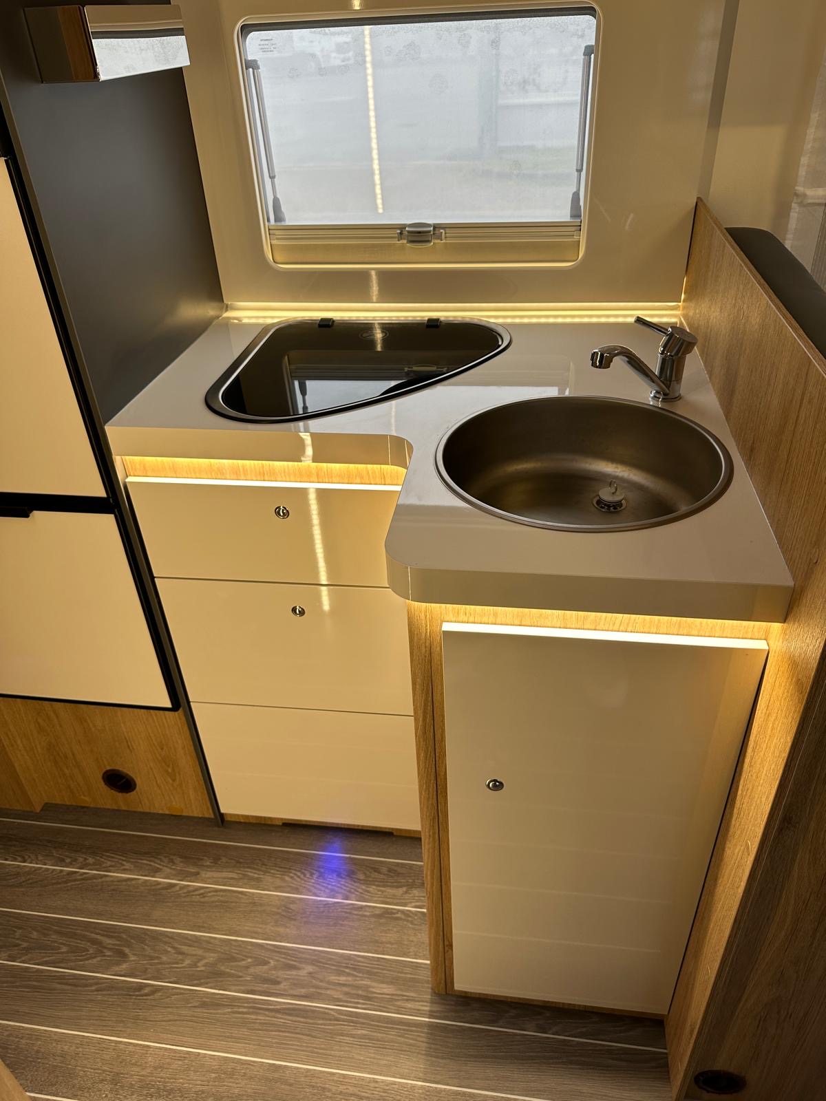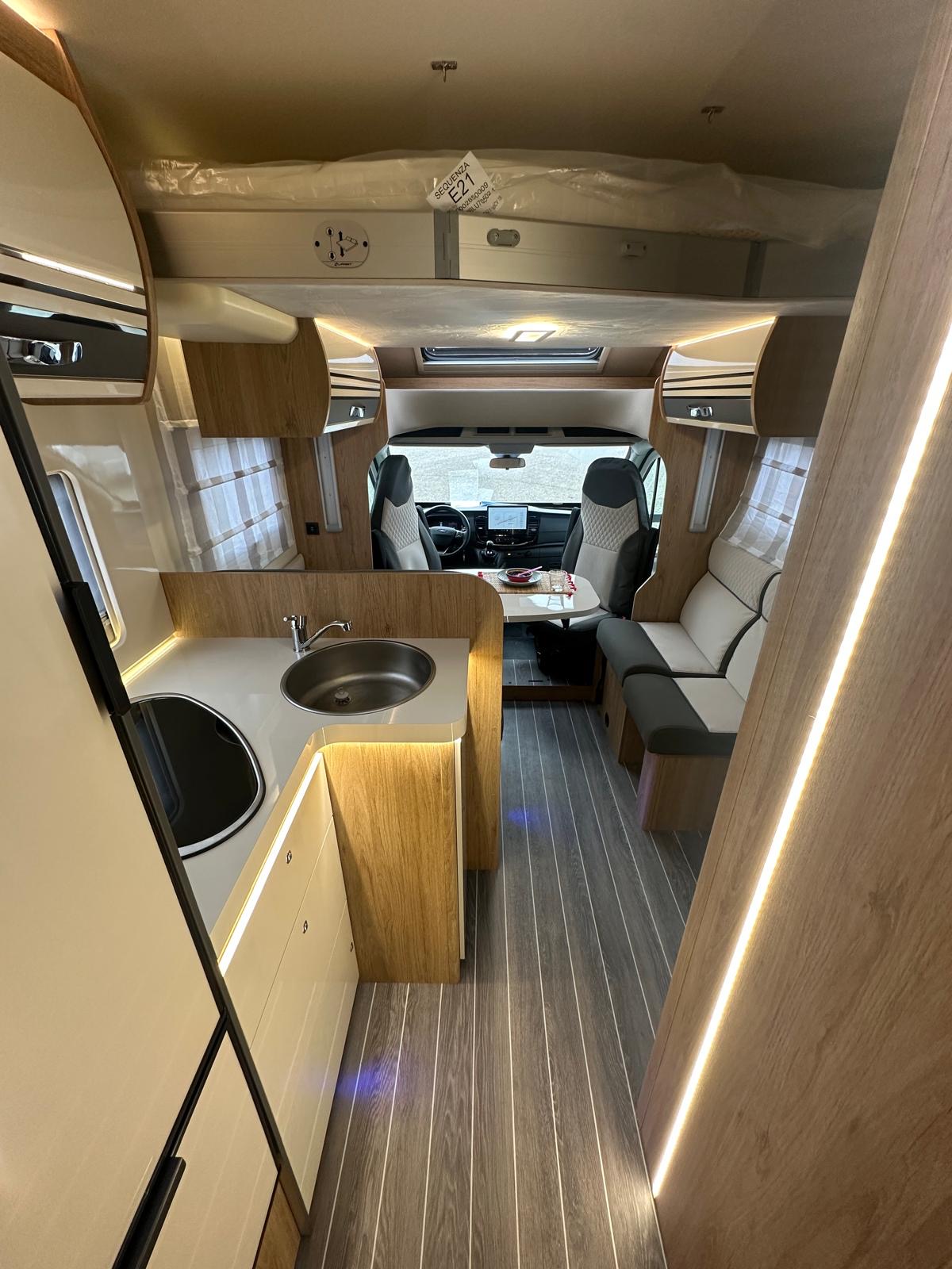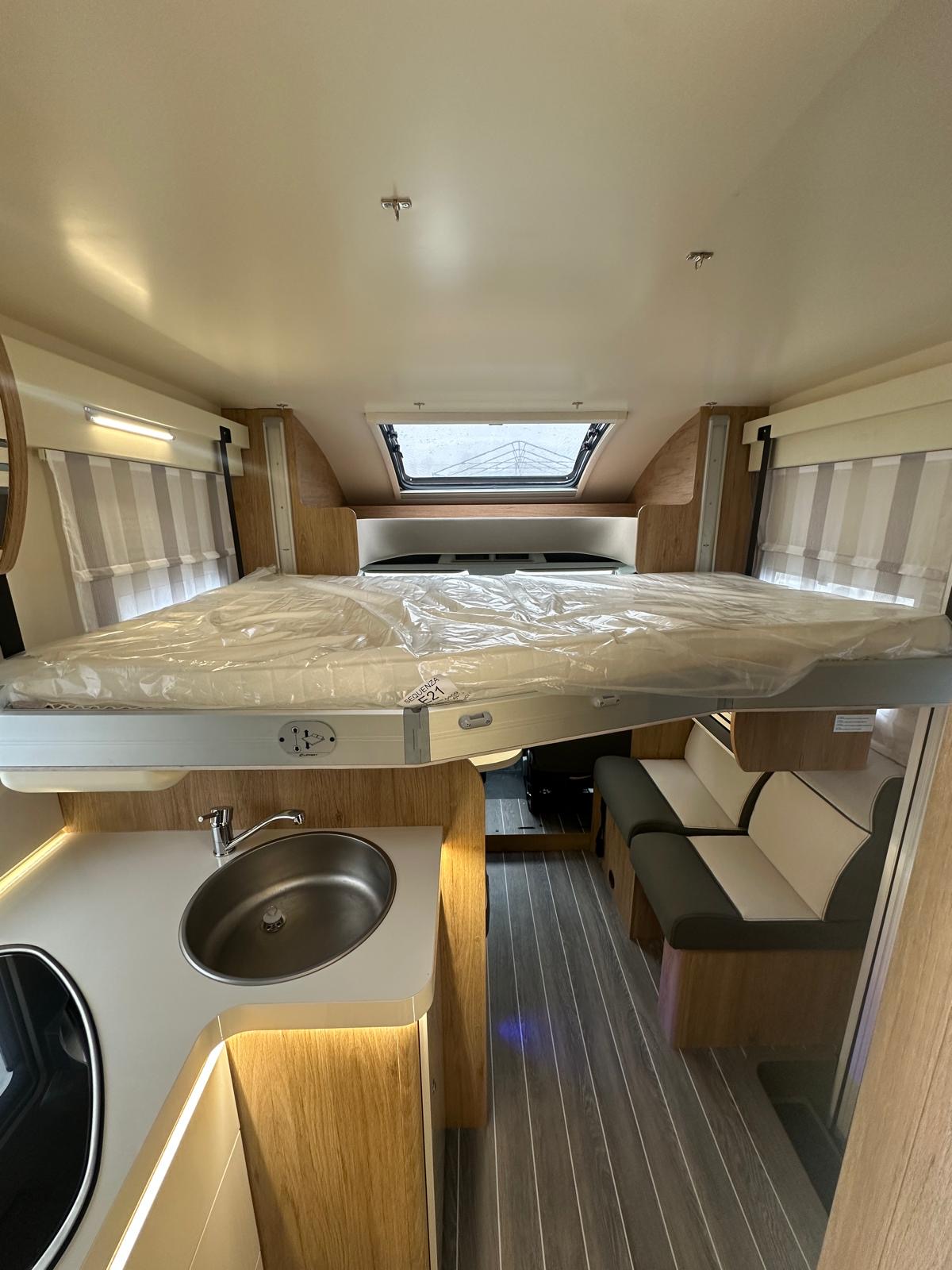 Perfetto mix tra eleganza e praticità, con letto matrimoniale in coda e basculante centrale. Ideale per chi cerca comodità senza rinunciare a uno stile moderno e accogliente.